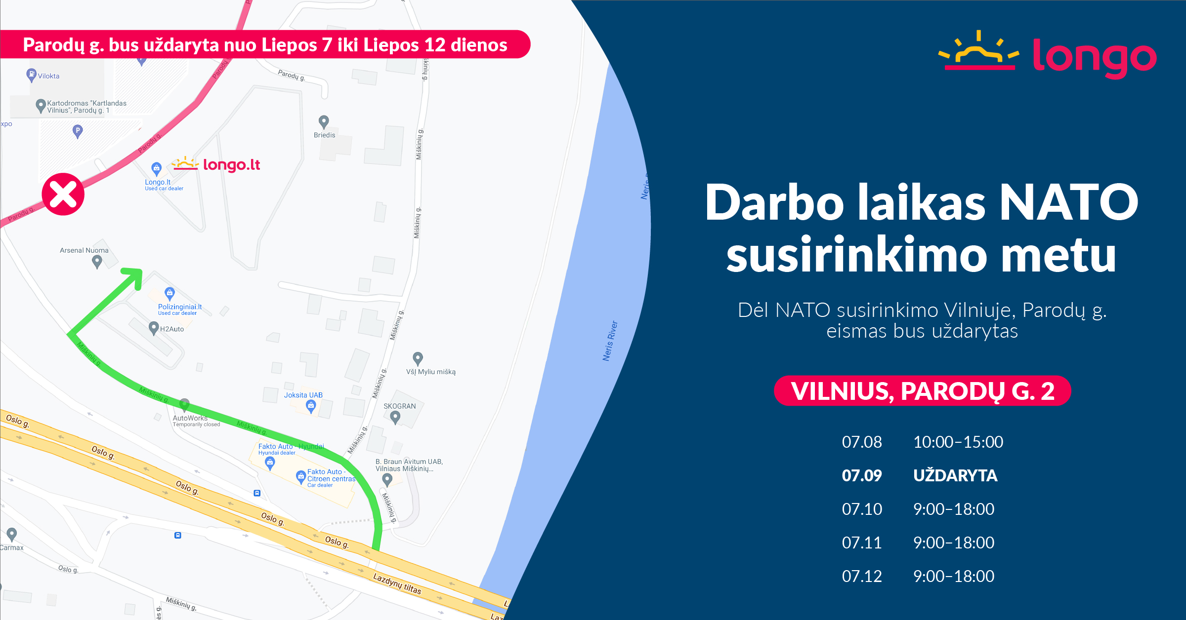 Kadangi nuo Liepos 7 dienos iki Liepos 12 dienos bus uždaryta Parodų gatvė, mūsų padalinį Vilniuje galėsite pasiekti pagal šią schemą: